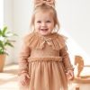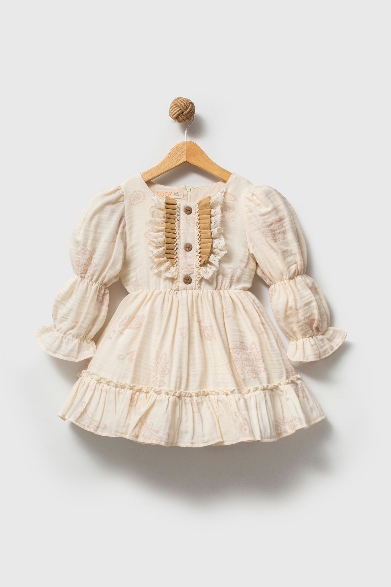 Neckline and Front Detail: Designed with a square neckline and a vertical ruffle embellishment down the center front, which includes a tan/brown ribbon strip. The rustic look is completed with wood-look buttons placed next to the ruffle.