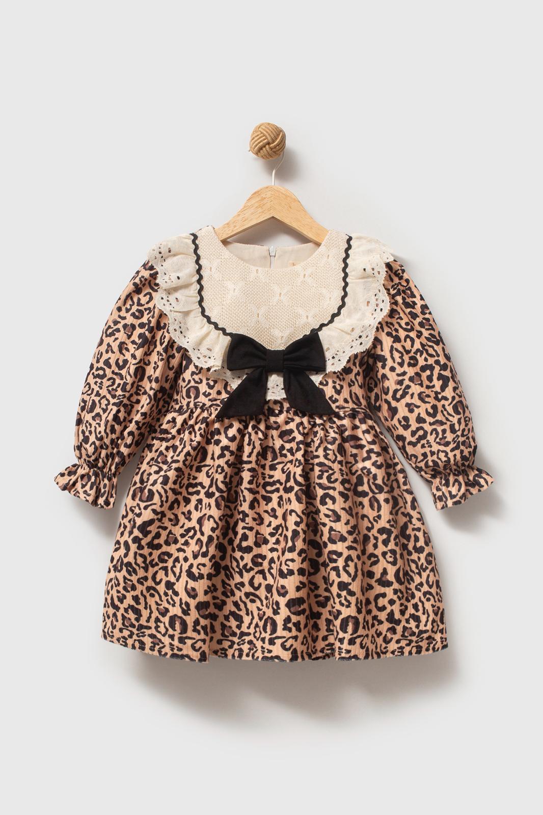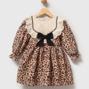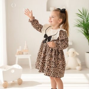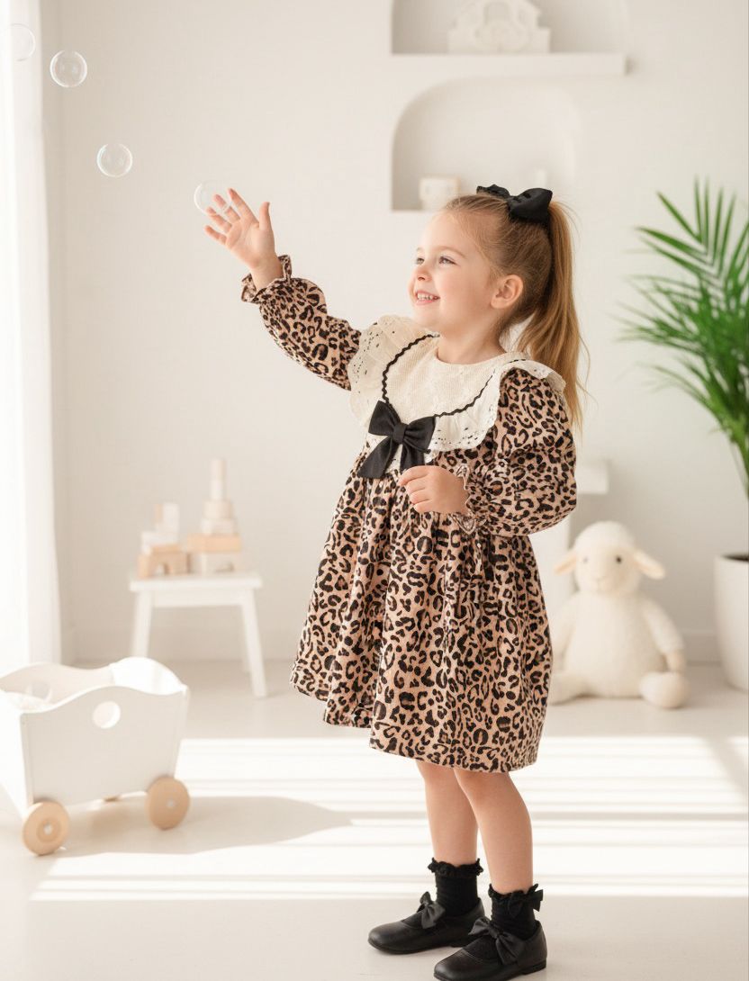 Return To ShopBu sevimli kız çocuk elbisesi, modern modayı klasik detaylarla harmanlayarak göz alıcı bir tasarım ortaya çıkarıyor. Leopar desenli kumaş eğlenceli ve stil sahibi bir dokunuş katarken, beyaz dantel yaka yumuşak ve zarif bir kontrast sağlıyor. Ön kısımdaki büyük siyah fiyonk ise elbisenin tatlı ve zarif görünümünü pekiştiriyor.